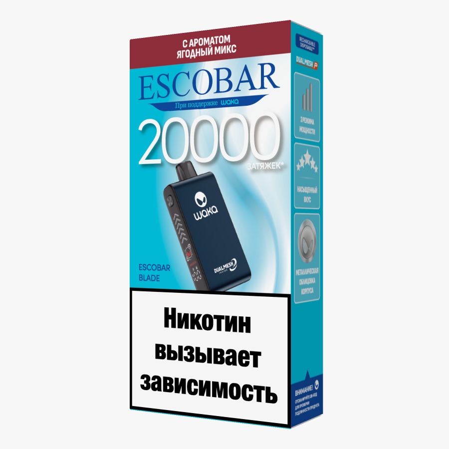 Escobar BLADE by WAKA 20000! всё продумано до мелочей! ✨ Чем впечатляет новинка: ☑️ корпус из сплава алюминия, который идеально ложится в руку ☑️ боковой дисплей с динамической подсветкой, отображающий уровень жидкости и заряд батареи. 3 режима мощности, легко переключаемых кликом ☑️ современный испаритель DUALMESH-P, с которым каждый аромат ещё насыщеннее. долговечность и мощь: до 20 000 затяжек.