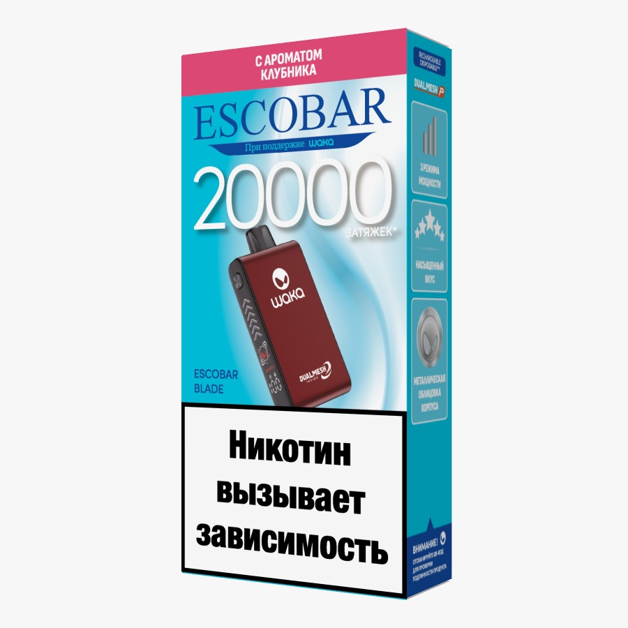 Escobar BLADE by WAKA 20000! всё продумано до мелочей! ✨ Чем впечатляет новинка: ☑️ корпус из сплава алюминия, который идеально ложится в руку ☑️ боковой дисплей с динамической подсветкой, отображающий уровень жидкости и заряд батареи. 3 режима мощности, легко переключаемых кликом ☑️ современный испаритель DUALMESH-P, с которым каждый аромат ещё насыщеннее. долговечность и мощь: до 20 000 затяжек.